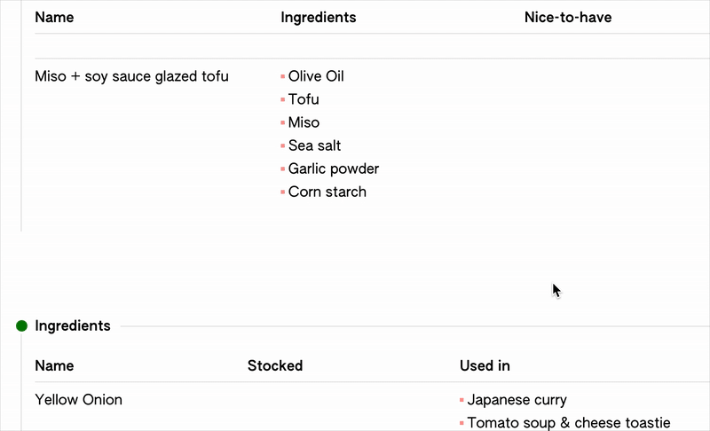 Iām working on creating a sample āgroceriesā project to develop the interface with, using a dataset I assembled of our typical recipes and grocery list. As ever, working with test data is challenging my assumptions about what the editor should be able to accomodate: I have two properties in my recipes table, āingredientsā, and ānice-to-haveā, which both reference my āingredientsā table. Then in the ingredients table, I have a āused byā property, which you would expect to be linked to both of these recipe props. However, this isnāt allowed by my schema editing function (which happily my error-catching prevented), because although it would be mostly doable structurally, it would be difficult to resolve in the interface. I.e. when you opened the dropdown to select recipes for "used by", there would be no default way of specifying or knowing if it would make a relation with the "ingredients" or the "nice-to-have" property in Recipes.